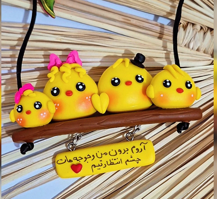 چهار جوجه کوچولوی زرد رنگ با کلاه و پاپیون، در کنار هم روی یه تاب چوبی بامزه جمع شدن تا نمادی از یه خانواده دوستداشتنی باشن. این آویز با خمیر پلیمری و نخ ماکارون با دست ساخته شده و تکتک جزئیاتش با عشق و دقت طراحی شده.